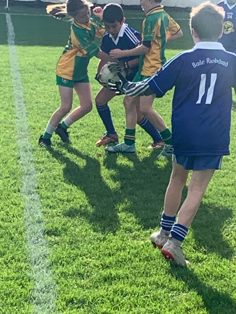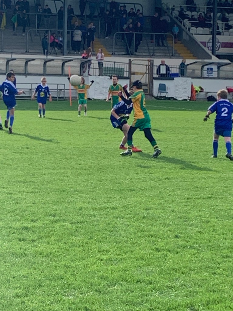 While the Ballymore and Robertstown mens’ teams took a well earned half time break during the Junior A final the U10’s players from both clubs took to the field in two separate games. The players only had a few minutes to entertain the crowd but they took advantage of their opportunity and showed off a range of their skills. The defences on both sides were very brave, putting in score saving tackles while the midfield players were working their socks off running from defence to attack. When the forwards were able to breach the defence they coolly took their scores. We can be sure that this won’t be the last time we see these players in St. Conleth’s!