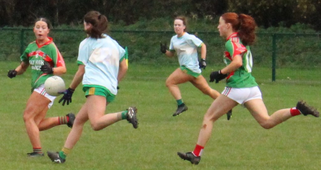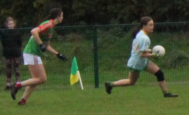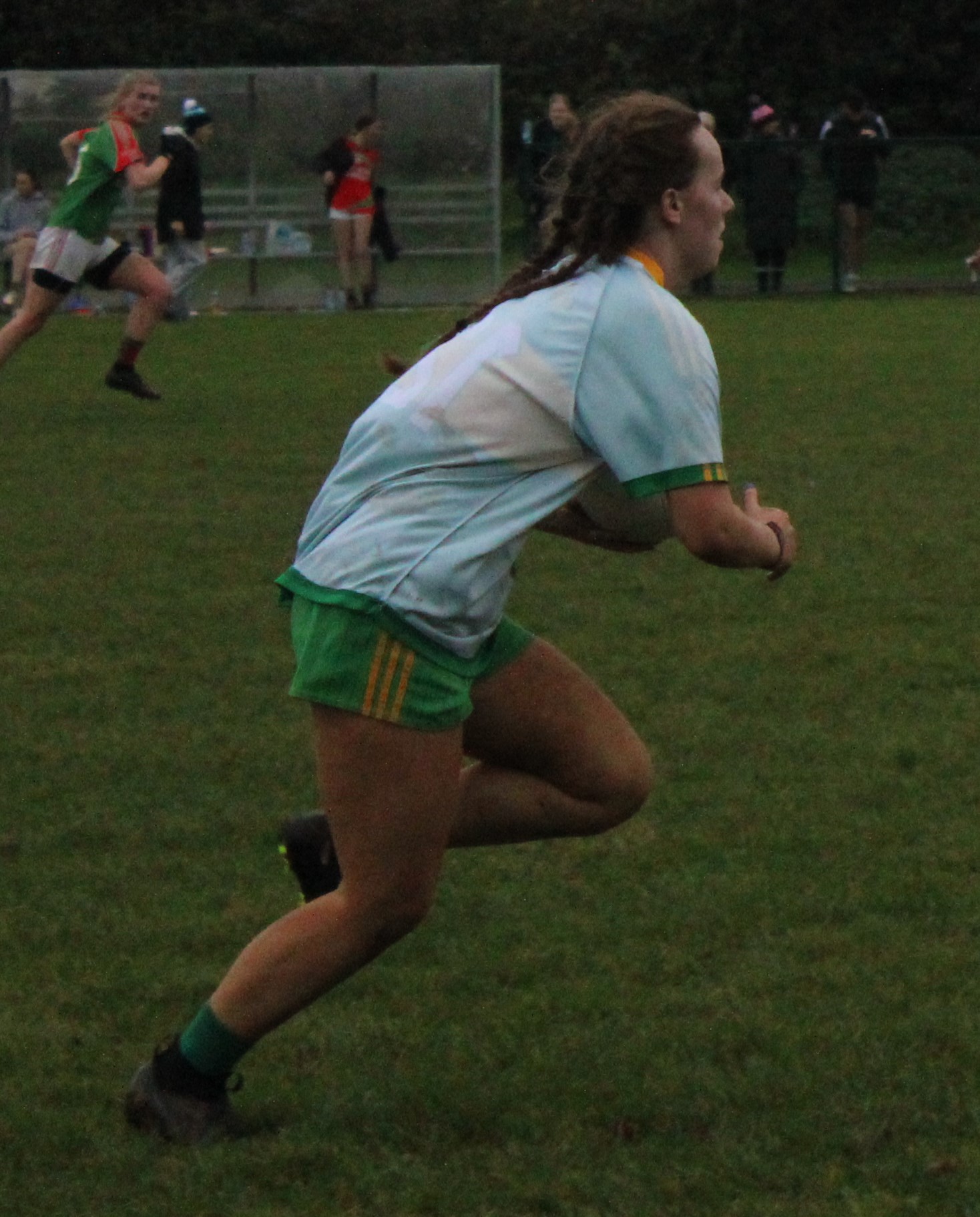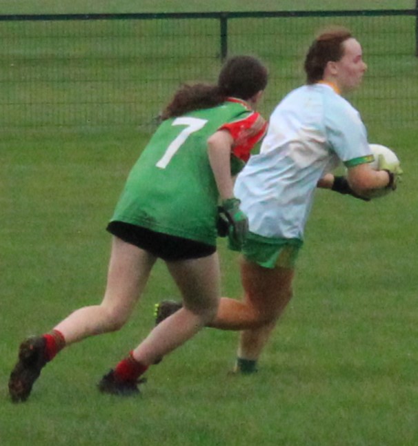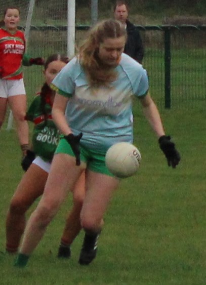 Following on from their win against Milltown in Round 4, BME Minor girls were expecting a great battle for a place in the final. Milltown won the throw up but no score materialised. Ball was back up the pitch with BME getting two in the back of the net in quick succession. This spurred the Milltown girls into scoring the next three, 2 points and a goal before two more points from BME. Great vigor from Milltown, gets them another goal bringing them level and then a further point to give them the lead for the first time. An additional point apiece for both teams rounded off the first half leaving half time score BME (2 – 03) Milltown (2 – 04).