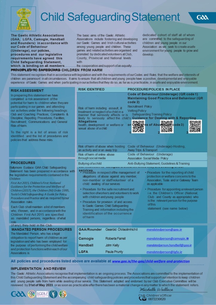 We in Ballymore Eustace GAA Club are committed to the development of all players, regardless of ability, in a healthy and welcoming environment. This Code of conduct addresses the levels of behaviour, practice and conduct required from our Young Players, Coaches, Supporters, Parents/Guardians and Referees.