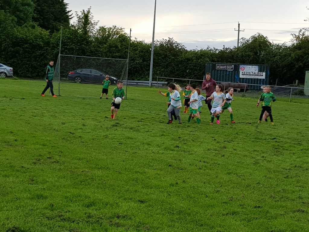 Ballymore travelled to Ballyteague on Thursday evening for the opening game of the Southboard U7’s league. The game got off to a frantic start with Ballyteague going on the attack first. The Ballyteague shots were raining in but the Ballymore goalkeeper was holding firm. Ballymore managed to break the siege and started to turn the screw up the other end.